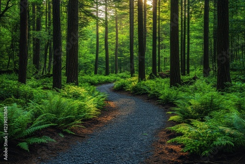 Fototapeta premium Tranquil Forest Pathway in Impressionist Style Surrounded by Lush Greenery...