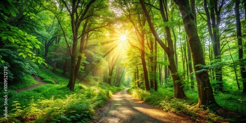 Fototapeta premium Tranquil Forest Pathway Surrounded by Lush Green Trees and Sunlight Filtering...