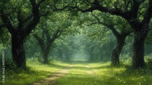 © Thanyaporn, Obraz premium Tranquil Forest Pathway Surrounded by Lush Green Trees in Nature