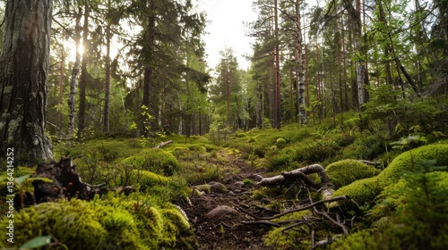 Obraz premium Tranquil Forest Pathway Surrounded by Lush Greenery and Sunlight