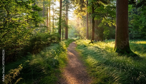 Fototapeta premium tranquil forest pathway surrounded by lush greenery and tall trees in soft morning light