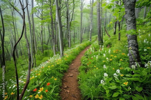 Fototapeta premium Tranquil Forest Pathway Surrounded By Lush Greenery And Wildflowers