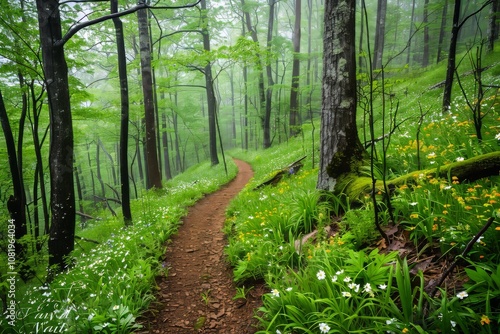 Fototapeta premium Tranquil Forest Pathway Surrounded By Lush Greenery And Wildflowers