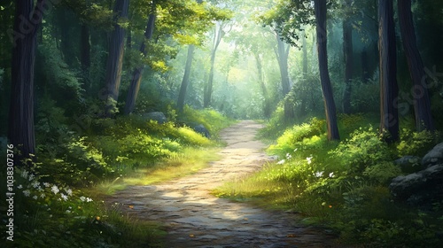 Obraz premium Tranquil Forest Pathway Surrounded by Nature Sounds