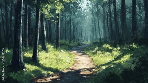© euthan, Obraz premium Tranquil Forest Pathway Through Lush Green Trees and Sunlight