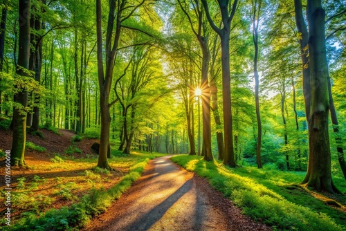 Fototapeta premium Tranquil Forest Pathway Through Lush Green Trees Inviting Nature Walks and...