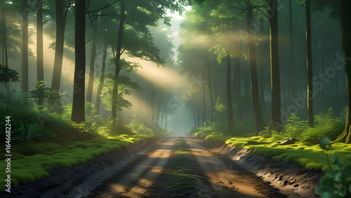 © Muhammad, Fototapeta premium Tranquil Forest Pathway with Morning Sunbeams and Mist