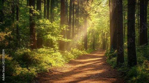 © Kitta Studio, Obraz premium Tranquil Forest Pathway with Sunlight Filtering Through Trees