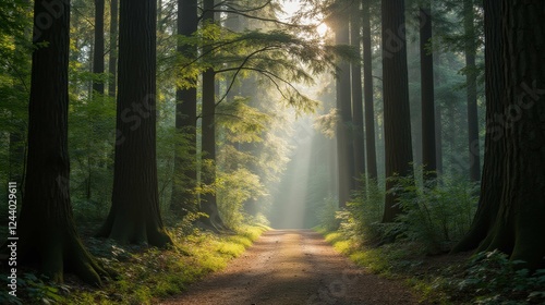 © Kitta Studio, Obraz premium Tranquil Forest Pathway with Sunlight Filtering Through Trees