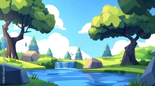 © chesleatsz, Naklejka premium Tranquil Forest River with a Waterfall