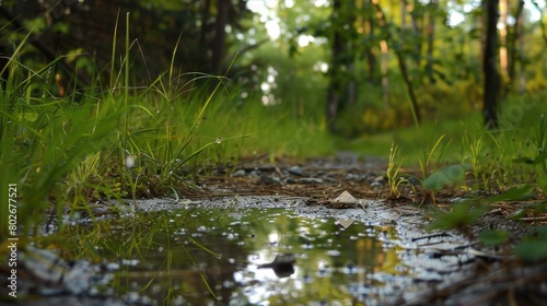 Naklejka premium Tranquil Forest Scene: Wet path, lush greenery, serene setting