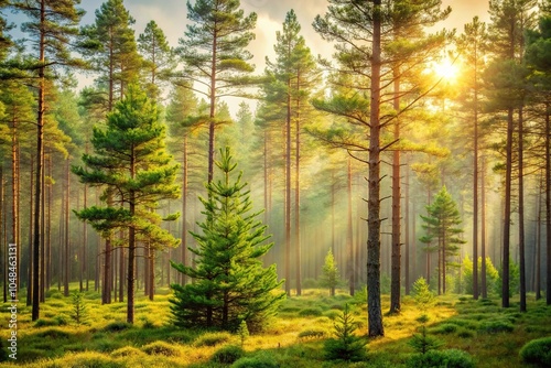 © Latsamee, Fototapeta premium Tranquil forest scene with delicate pine trees in soft light
