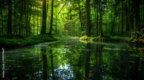 © Nhoeb, Obraz premium Tranquil Forest Scene with Lush Greenery and Reflective Water Surface