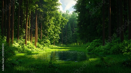 © Arthur Constantine, Fototapeta premium Tranquil Forest Scene with Lush Greenery and Serene Water Reflection