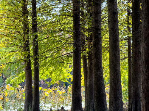 © evening_tao, Naklejka premium Tranquil Forest Scene with Lush Greenery and Tall Trees in Autumn Light