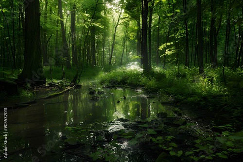 Obraz premium Tranquil forest scene with sunlight filtering through lush green trees.