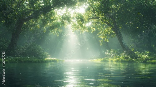 © Tyrah, Obraz premium Tranquil Forest Scene with Sunlight Filtering Through Trees and Reflecting on Calm Water Surface in a Serene Natural Environment