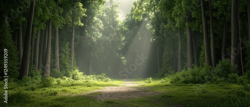Fototapeta premium Tranquil forest scene with tall trees and sunlight