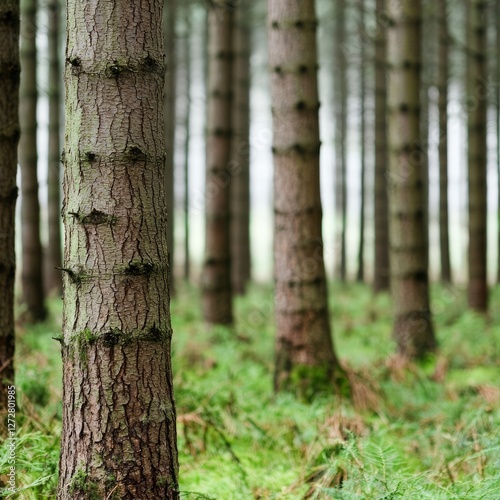 Fototapeta premium Tranquil forest scene with tall trees surrounded by lush green undergrowth