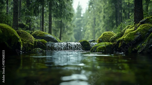 Obraz premium Tranquil forest stream flowing over moss-covered rocks.