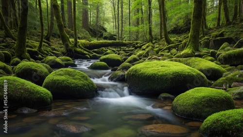 Obraz premium Tranquil forest stream flowing over mosscovered rocks in lush greenery