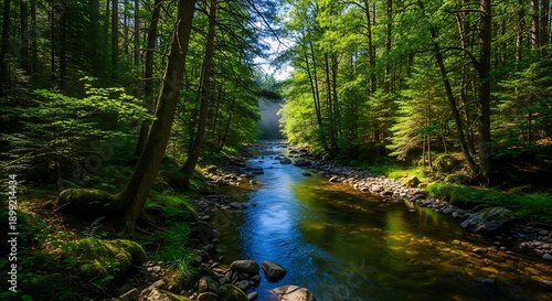 Obraz premium Tranquil Forest Stream Flowing Through Lush Green Trees and Sunlight Rays
