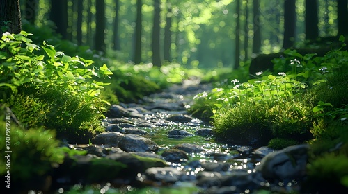 © Arthur Constantine, Obraz premium Tranquil Forest Stream Flowing Through Lush Green Wilderness