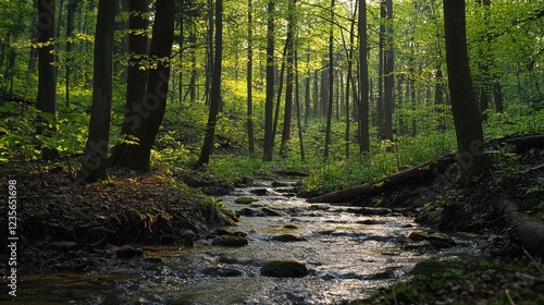 © Kitta Studio, Obraz premium Tranquil Forest Stream Flowing Through Lush Greenery and Trees
