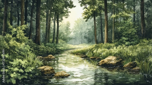 © Almahyra, Obraz premium Tranquil forest stream, lush greenery, sunlight filtering. Use Nature background, wallpaper