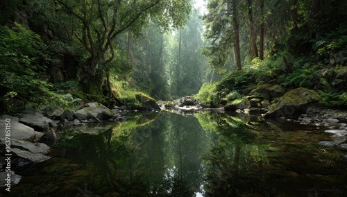 © Neni, Obraz premium Tranquil forest stream reflects lush greenery
