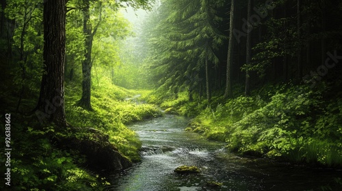 Obraz premium Tranquil forest stream surrounded by lush greenery and tall trees