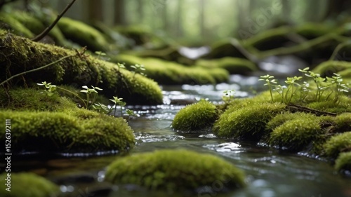 © Annyss, Naklejka premium Tranquil Forest Stream with Moss and Wild Tiny Flowers