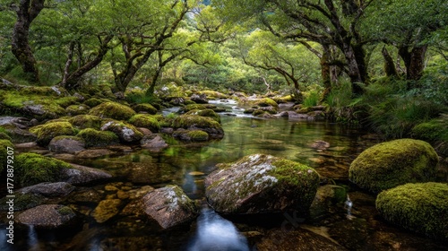 Obraz premium Tranquil forest stream with moss-covered rocks and lush green trees in serene...