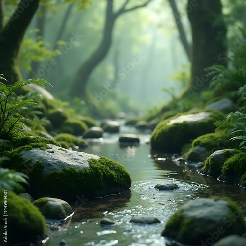 © Perfectimagehub, Fototapeta premium Tranquil Forest Stream with Moss-Covered Stones and Flowing Water