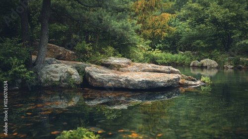 Fototapeta premium Tranquil Forest Stream with Rocky Shoreline