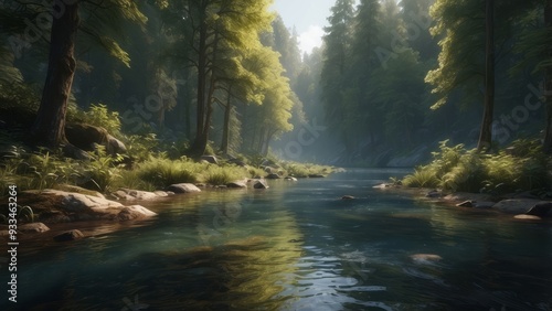 © Basileus, Obraz premium Tranquil Forest Stream with Sunlight Filtering Through Trees