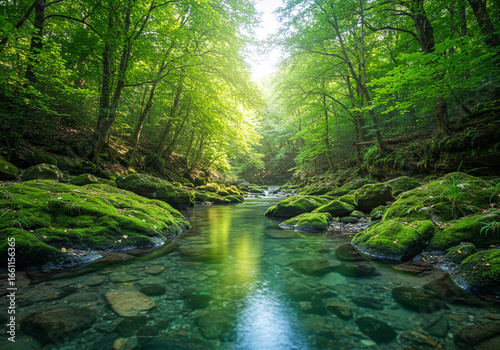 © MuhammadHassan, Obraz premium Tranquil Forest Stream with Sunlight Reflections – Nature Landscape