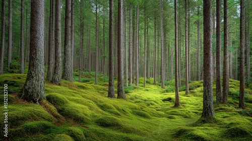© jureephorn, Obraz premium Tranquil forest walk lush green woodland nature photography serene environment ground-level perspective peaceful concept
