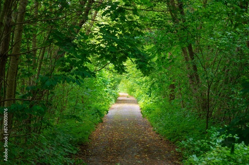 Fototapeta premium Tranquil Forest Walking Path Serene Nature. Relax, Hiking, Cycling, Walking, Alone, Meditation