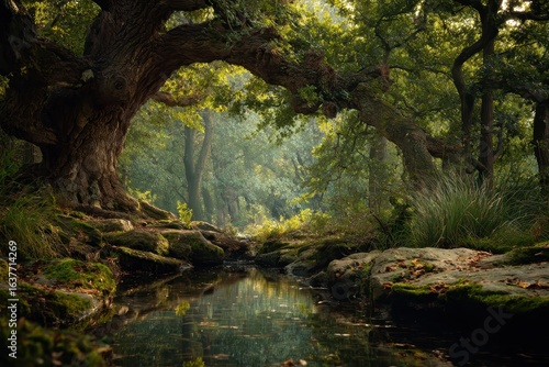 © Tanu, Fototapeta premium Tranquil forest with a winding stream and dappled sunlight filtering through the trees