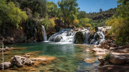Fototapeta premium Tranquil Fossil Creek Waterfall: A Serene Oasis of Blue Waters Amidst...
