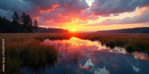 © Pat, Obraz premium Tranquil Foulshaw Moss bogland, sunset reflections , natural, UK