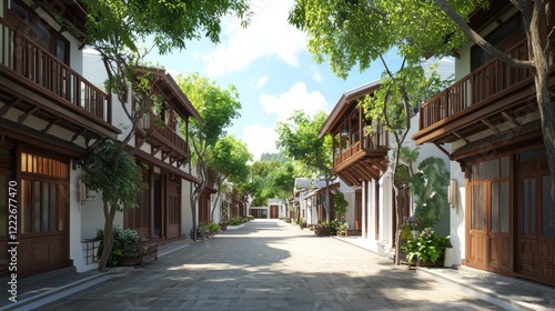 © Jakkarin, Fototapeta premium Tranquil Fusion of Old and New: Ultra-Detailed Thai Architecture in Historic City Street