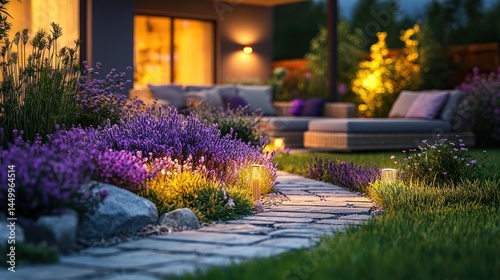 © Andy, Obraz premium Tranquil garden path with lavender at twilight