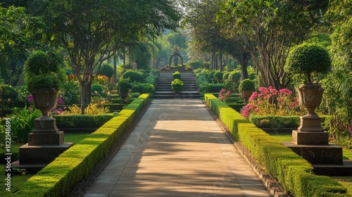© Aris Suwanmalee, Obraz premium Tranquil garden path with lush greenery.