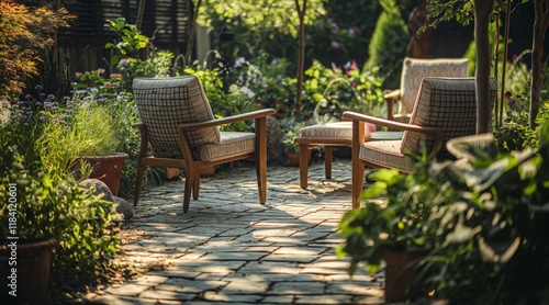 © filmanana, Obraz premium Tranquil Garden Setting with Wooden Chairs and Lush Greenery