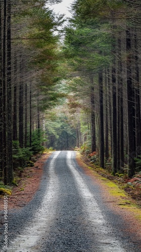 Naklejka premium Tranquil Gravel Road Through Pine Forest - Embracing Rustic and Rural Charm
