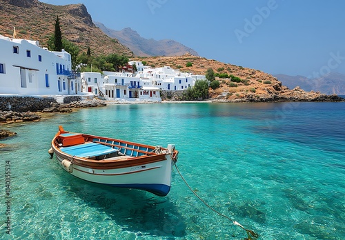 © Leo, Obraz premium Tranquil Greek Island Village Seascape With Boat