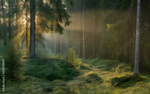 © Gina, Obraz premium Tranquil green forest with morning light and mist