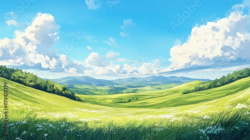 Obraz premium Tranquil green hills and meadows under a clear blue sky with soft white...